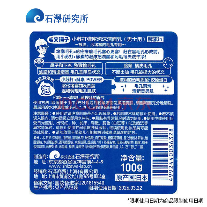 商品相册:石泽研究所小苏打泡沫洁面乳100g男士洗面奶清洁黑头毛孔控油新年礼物男生第