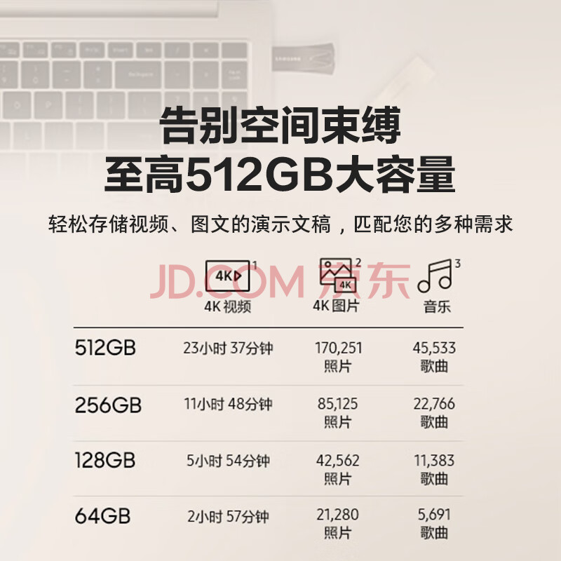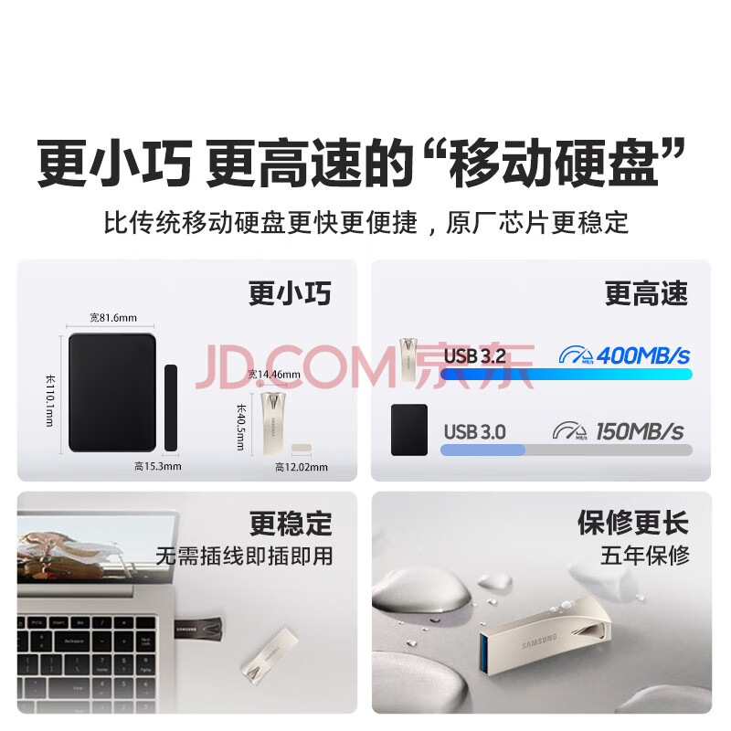 商品相册:三星(SAMSUNG)256GB USB3.1 U盘 BAR 学习办公金属高速优盘 车载U盘 读速400MB/s(Gen 1)香槟银 适用哨兵模式第