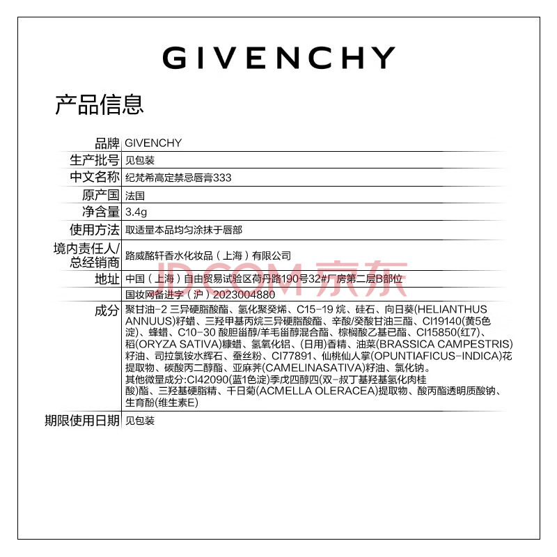 商品相册:纪梵希(Givenchy)小羊皮N333宝石红色口红唇膏显色顺滑化妆品生日礼物送女生送闺蜜第