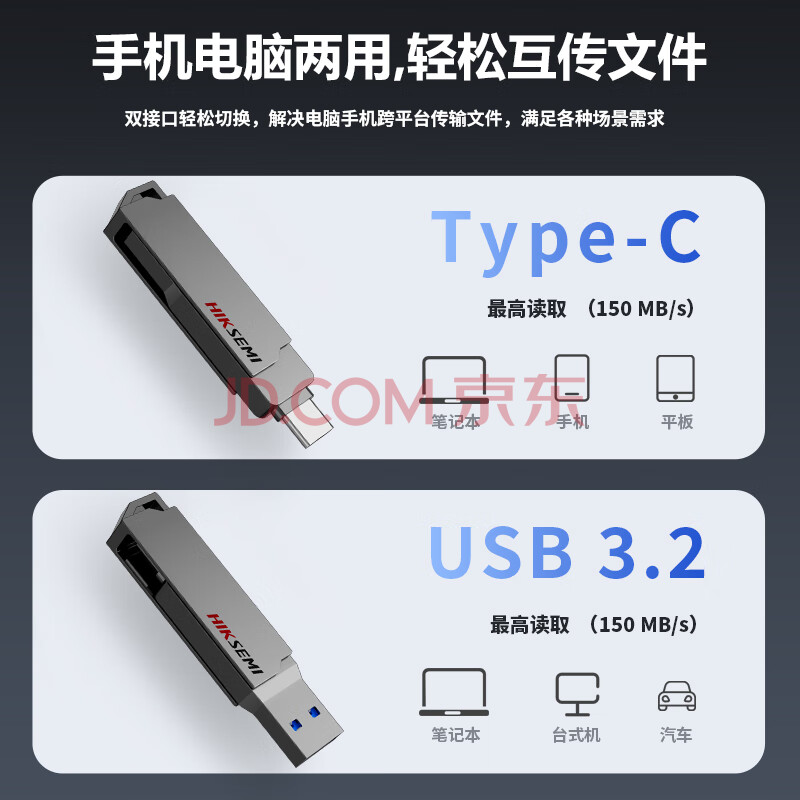 商品相册:海康威视(HIKVISION)128GB Type-C双接口插手机U盘大容量X307C USB3.2高速双头U盘 适用苹果华为电脑两用移动办公优盘第