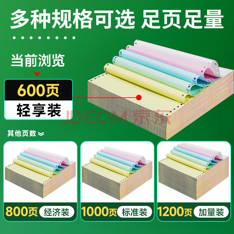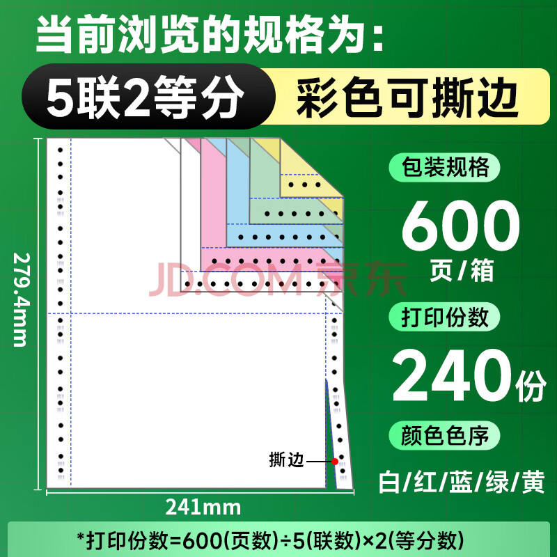 商品相册:天章 (TANGO)【缺页十倍赔】新绿天章五联二等分可撕边 针式电脑打印纸发票单 (241-5-1/2S 白红蓝绿黄 600页)第