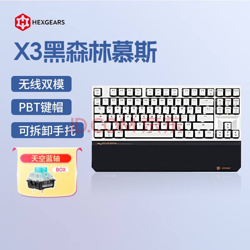 商品相册:黑峡谷(Hyeku)X3 有线/无线2.4G双模电竞机械游戏键盘87键PBT键帽黑森林慕斯凯华BOX天空蓝轴 附卡扣腕托第