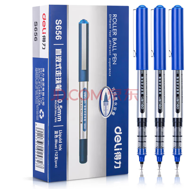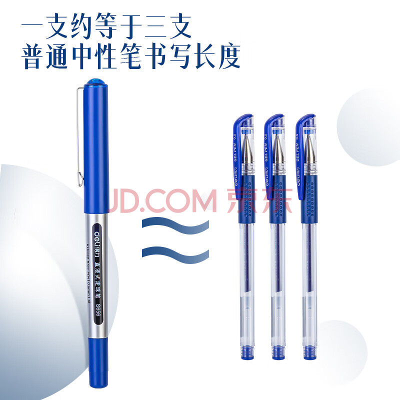商品相册:得力(deli)(deli)直液笔中性笔 0.5mm子弹头签字笔学生考试笔走珠笔水笔 蓝色 办公用品12支/盒S656第