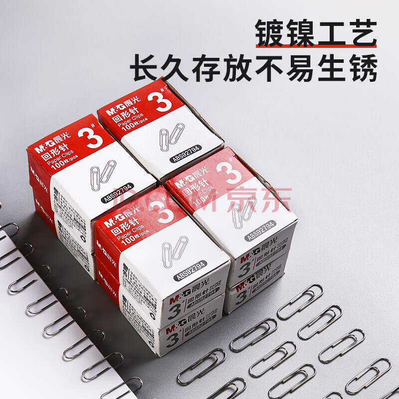 商品相册:晨光(M&G)3#镀镍回形针 金属防锈曲别针 办公用品 100枚/盒 10盒装ABS92794开学必备第1张/共4