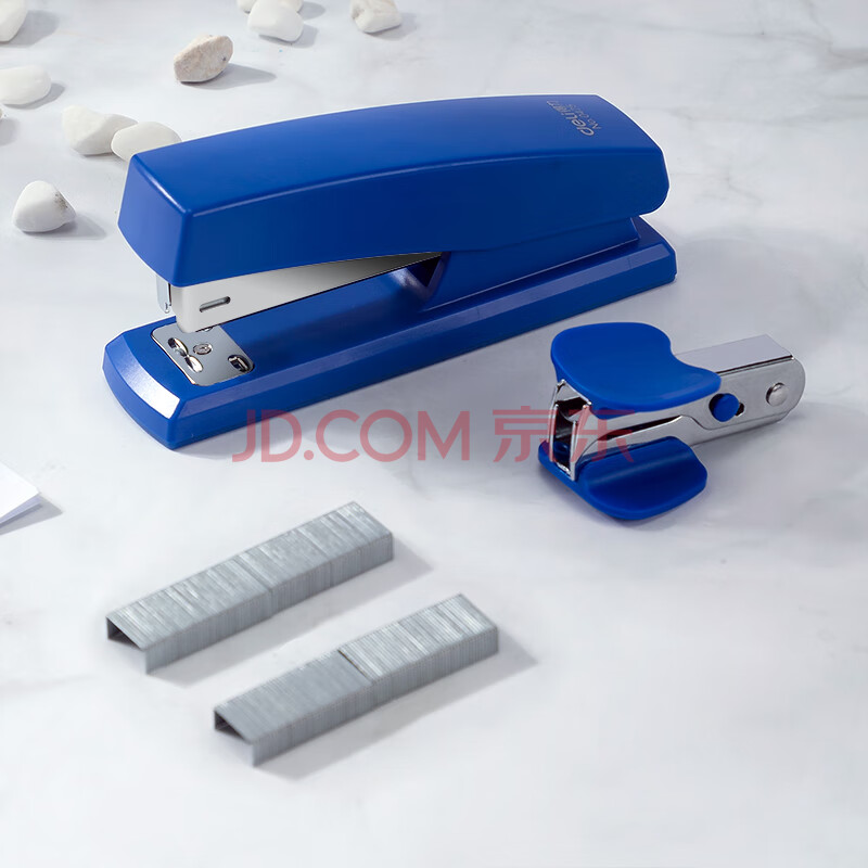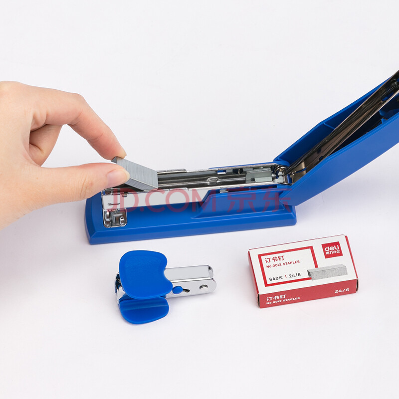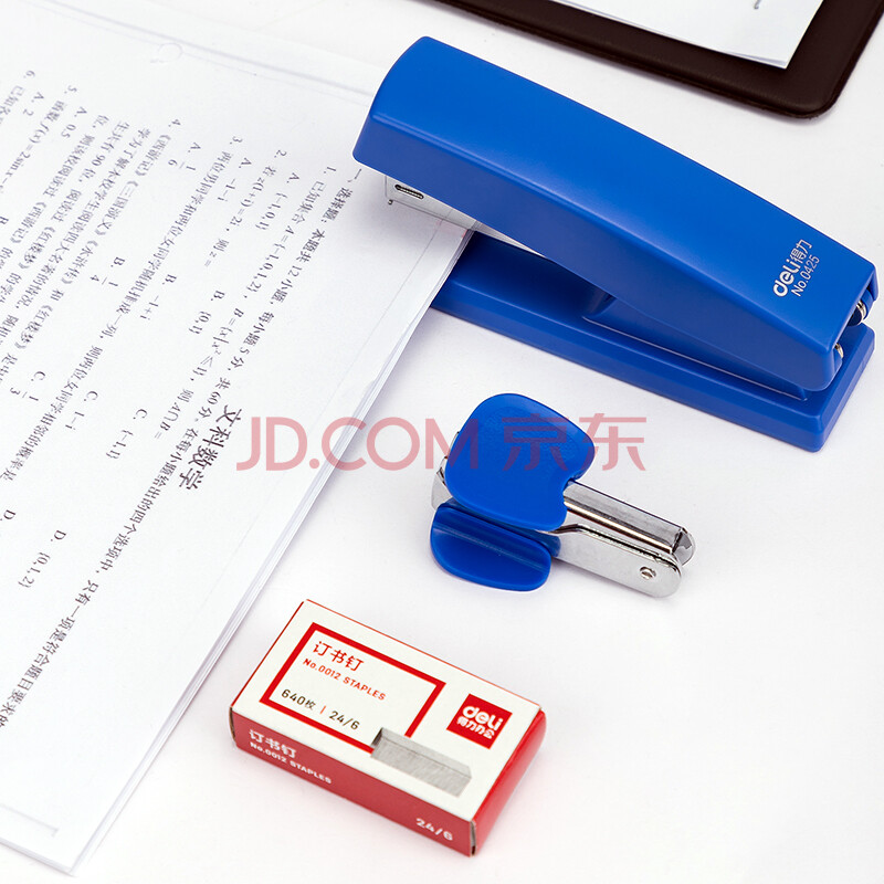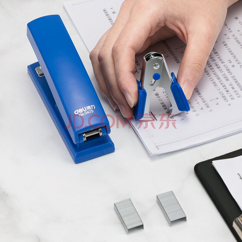 商品相册:得力(deli)订书机小号套装订书器办公用品文具学生专用附订书钉起钉器中号大订书器小型办公室 晴天蓝0354第