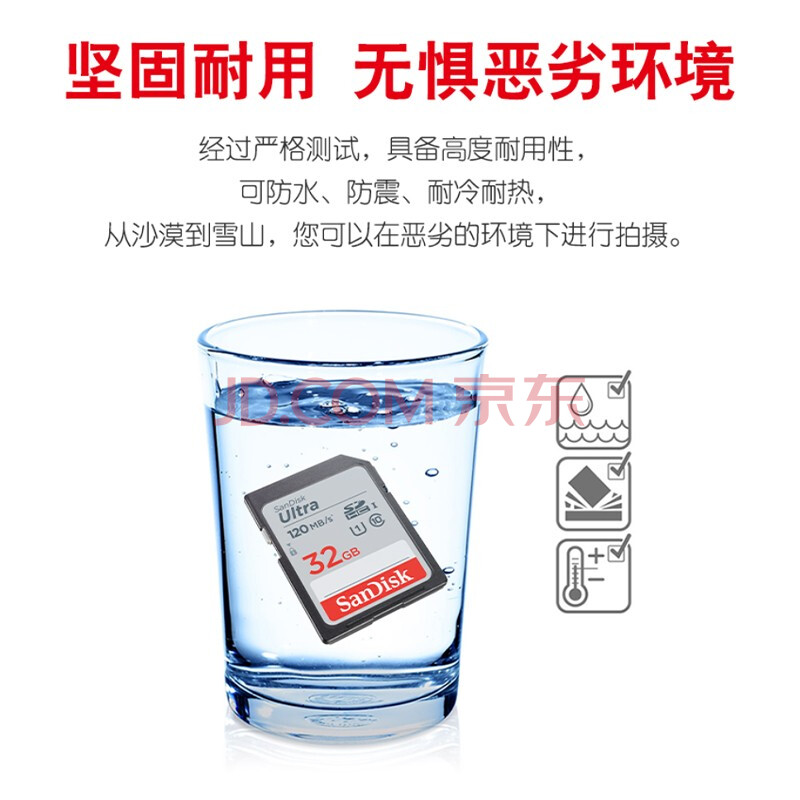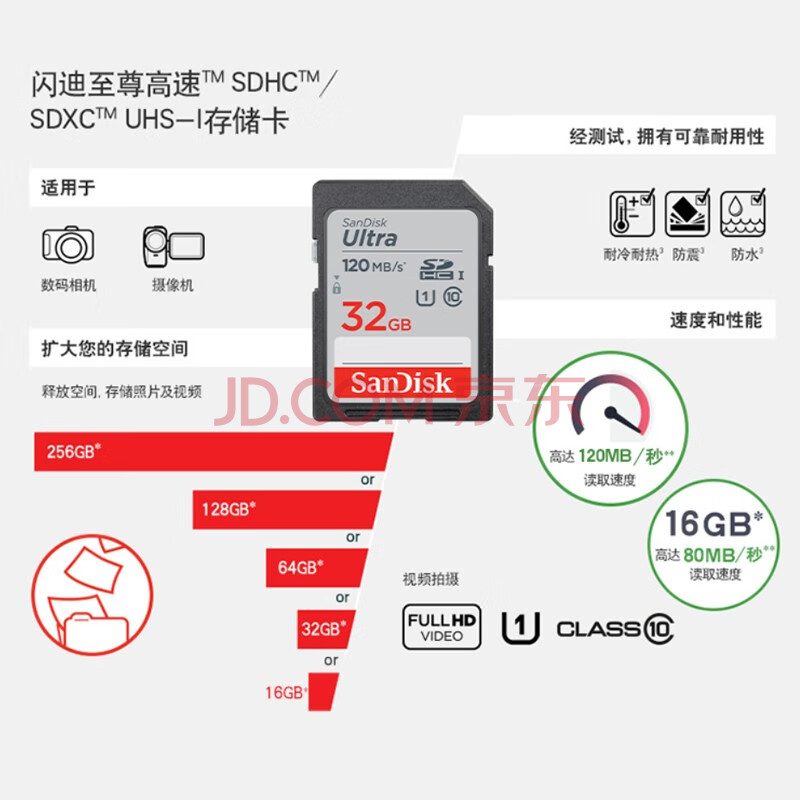 商品相册:闪迪(SanDisk)32GB SD内存卡 U1 C10 至尊高速存储卡 读速120MB/s 全高清视频 数码相机理想伴侣第