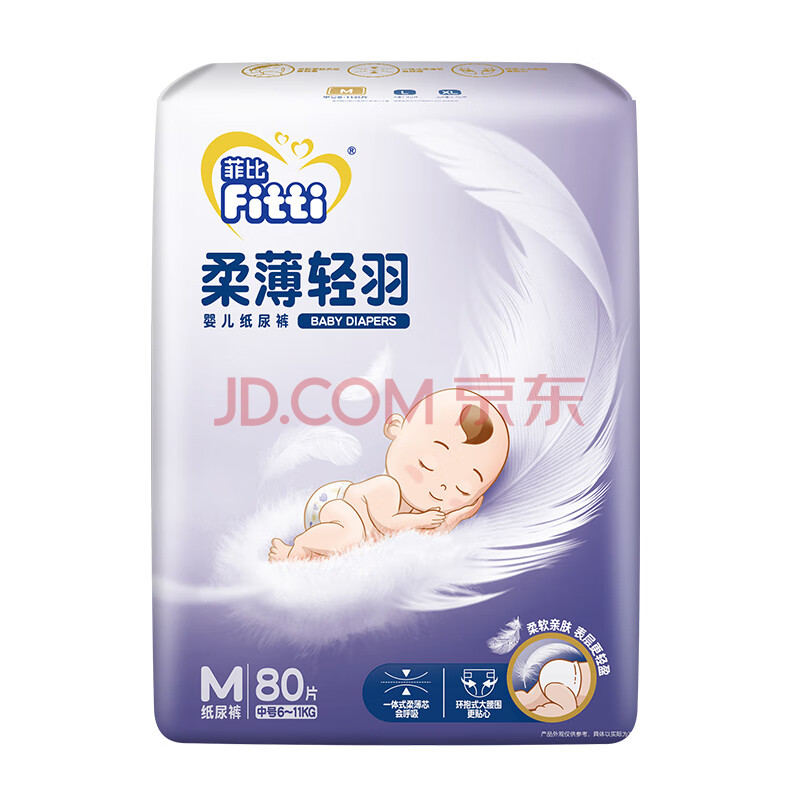 商品相册:菲比Fitti柔薄轻羽婴儿纸尿裤M80片(6-11kg)尿不湿柔感轻羽层柔软轻薄第