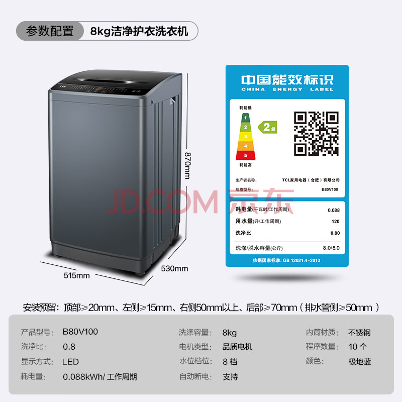 商品相册:TCL 洁净护衣波轮8KG小型洗衣机全自动家用家电 送装一体 B80V100第
