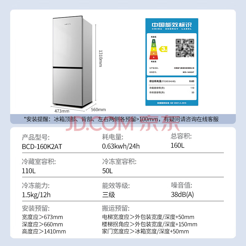 商品相册:新飞160升两门小型环保内胆宿舍租房节能小巧冰箱BCD-160K2AT第