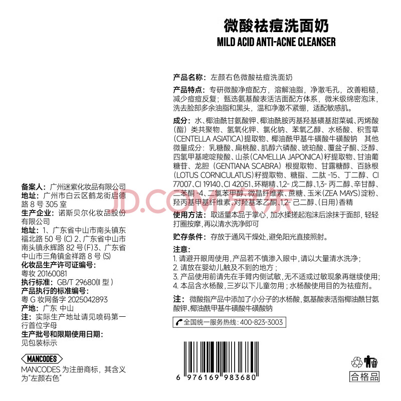 商品相册:左颜右色男士控油洗面奶男氨基酸祛痘去黑头收缩毛孔护肤品保湿洁面乳150g第