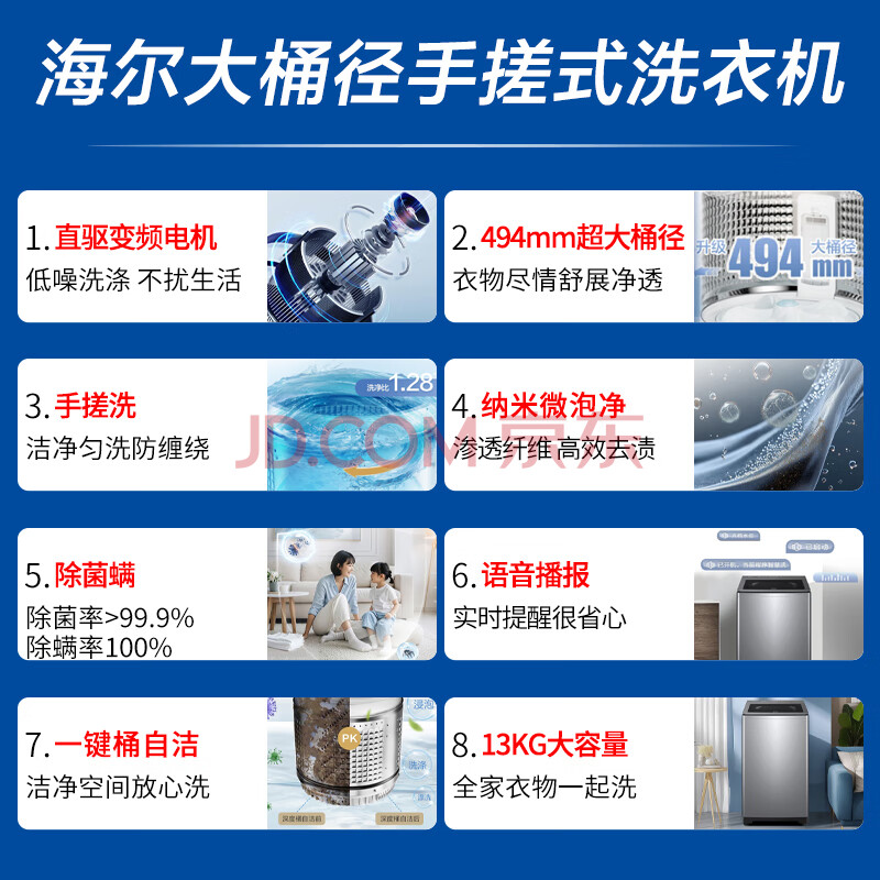 商品相册:海尔波轮洗衣机全自动13KG 新品上市 直驱一级变频 494超大筒 手搓洗 语音播报 商场同款XQB130-BS57A2第