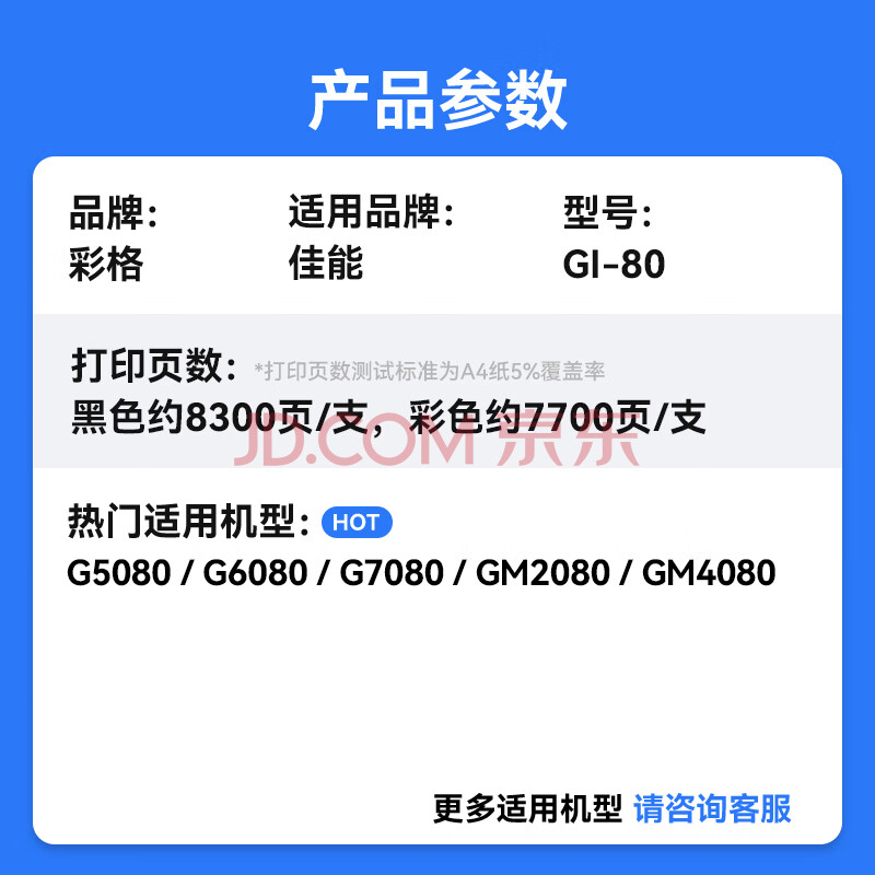商品相册:彩格GI-80四色墨水套装黑红青黄 适用佳能打印机Canon GM2080墨水 G5080墨水 G6080墨仓式打印机填充墨水第