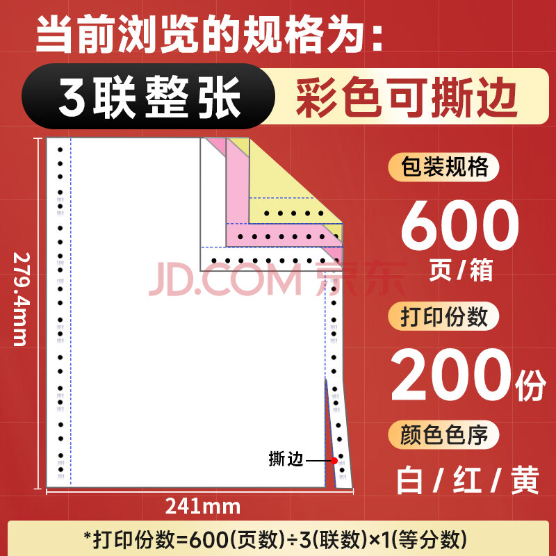 商品相册:天章 (TANGO)【缺页十倍赔】天章风三联整张可撕边 针式电脑打印纸 出入库送货清单600页241-3S(白红黄)-可定制第