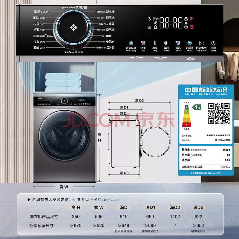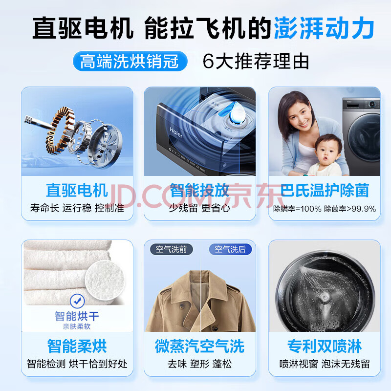 商品相册:海尔(Haier)全自动滚筒洗烘一体 洗衣机带烘干一体 10KG 直驱 空气洗 家电京东自营 EG100HMATE71S第