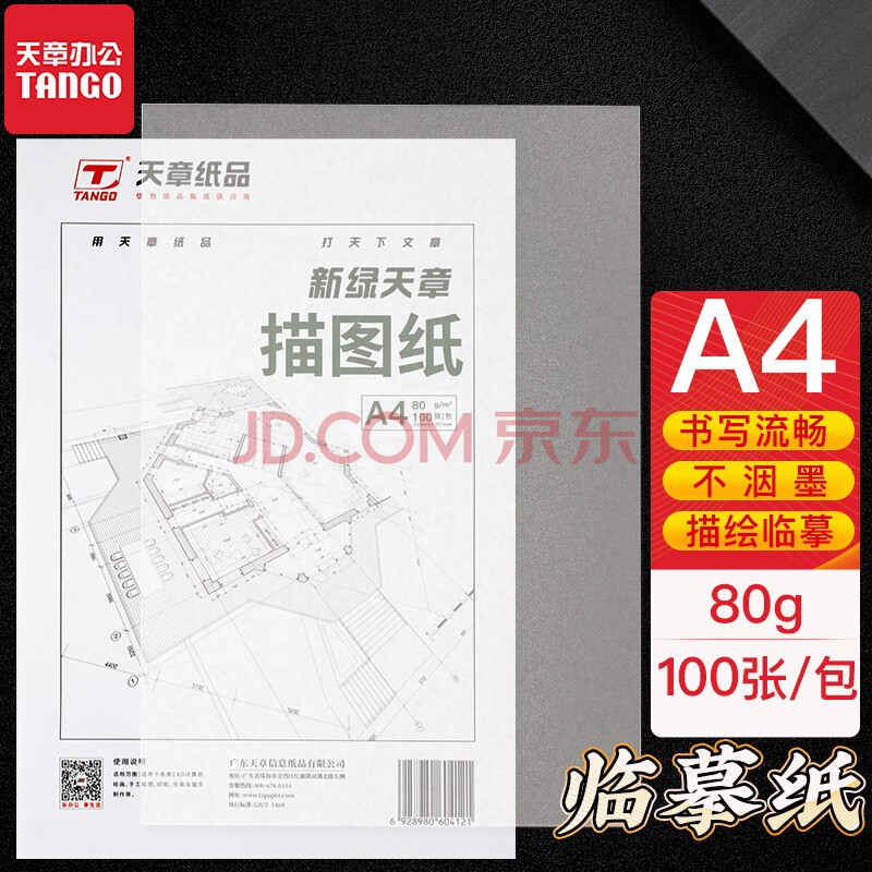 商品相册:天章 (TANGO)A4半透明描图纸硫酸纸 设计制图画图纸转印图纸 练字专用 工程描红绘图纸临摹拷贝纸 80g 100张/包第