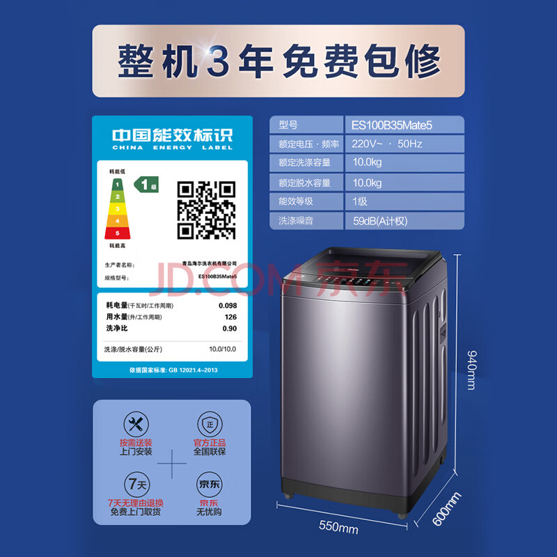 商品相册:海尔(Haier)波轮洗衣机全自动 10公斤 直驱变频电机 双动力防缠绕 羊毛护理 集速洗 ES100B35Mate5第