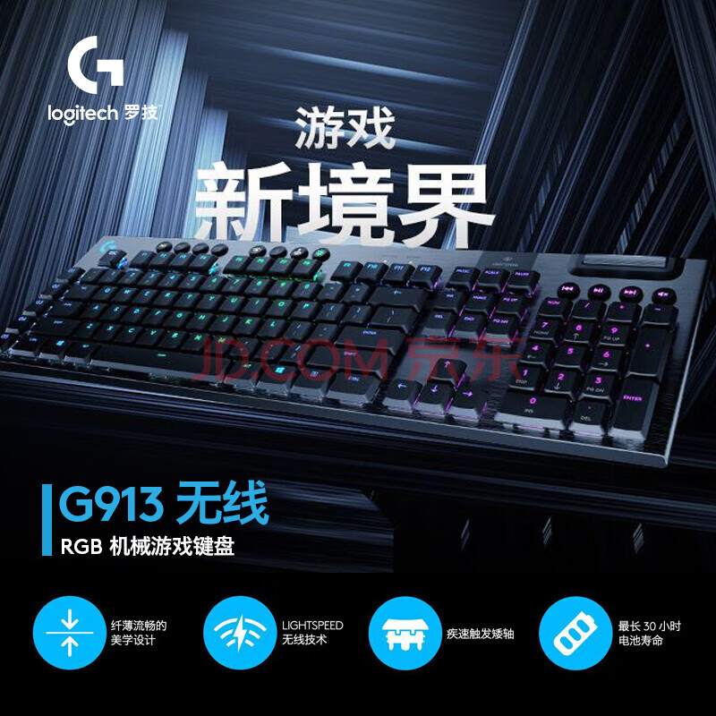 商品相册:罗技(G)G913 LIGHTSPEED RGB 无线机械游戏键盘(Clicky青轴) 无线超薄RGB矮轴 (C轴)类青轴手感第1张/共5