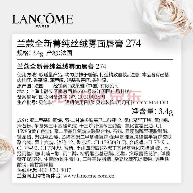 商品相册:兰蔻274口红丝绒雾面哑光杏仁奶茶唇膏显白化妆品礼盒送女友生日礼物第