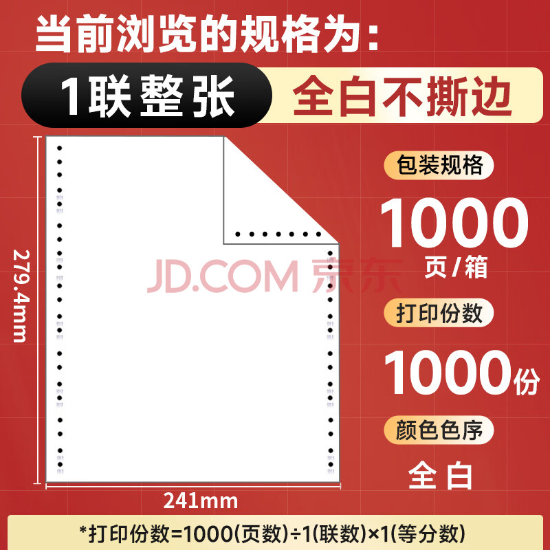 商品相册:天章 (TANGO)【缺页十倍赔】天章风一联整张不撕边 针式电脑打印纸 出入库送货清单 1000页 241-1(全白)-可定制第