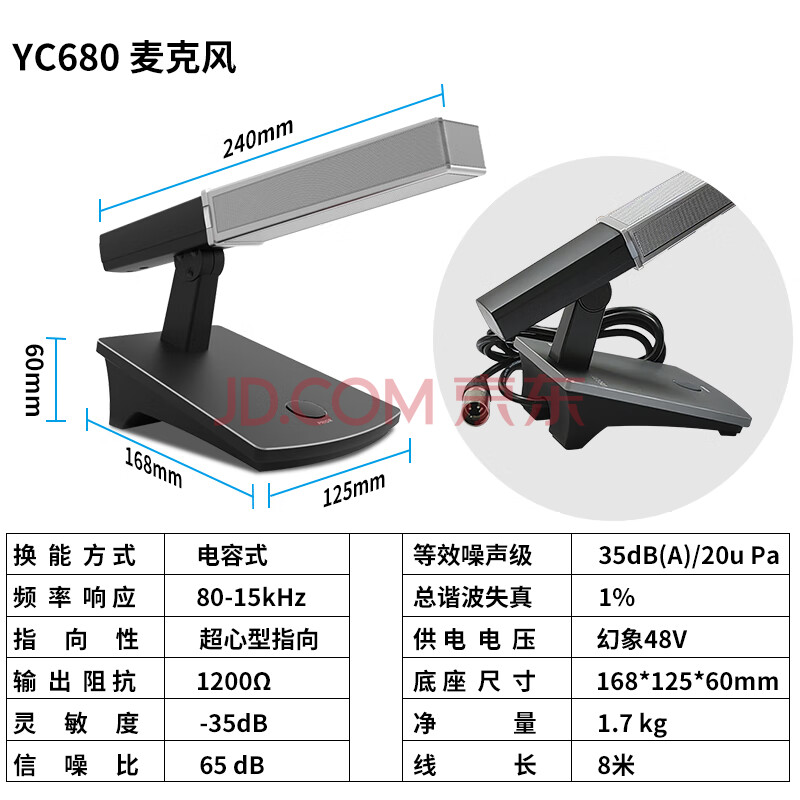 商品相册:唯舒 YC680 有线电容麦克风卡农口卡侬接口专业会议高端会议桌面方管款90度可调节话筒可定制接口第