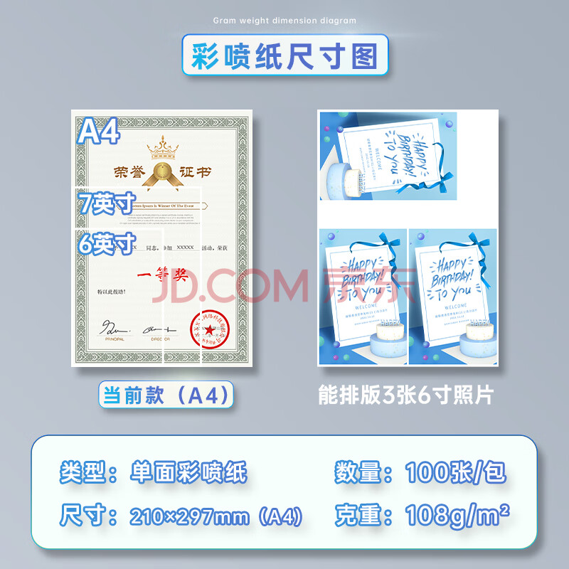 商品相册:得力(deli)A4 108g 彩色喷墨打印纸 宣传单广告传单打印纸 100张/袋 11832第