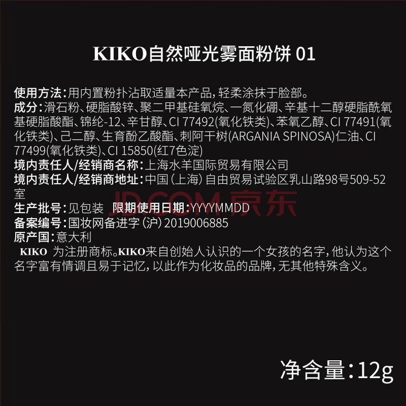 商品相册:KIKO自然哑光雾面粉饼-01自然色12g/盒 遮瑕定妆送女友女神节礼物第