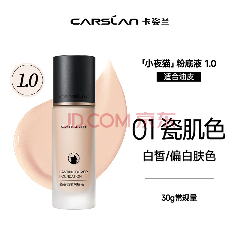 商品相册:卡姿兰(Carslan)小夜猫粉底液遮瑕持久保湿控油不脱妆油皮01#瓷肌色30g生日礼物女第