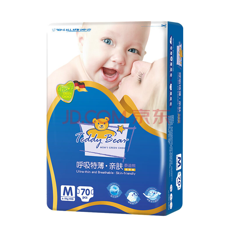 商品相册:泰迪熊(Teddy Bear)亲肤纸尿裤M70片(6-11公斤)婴儿尿不湿 超薄透气敏感肌第