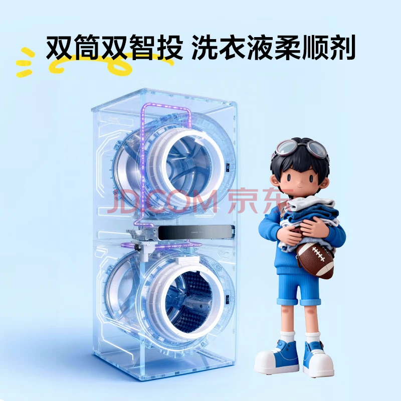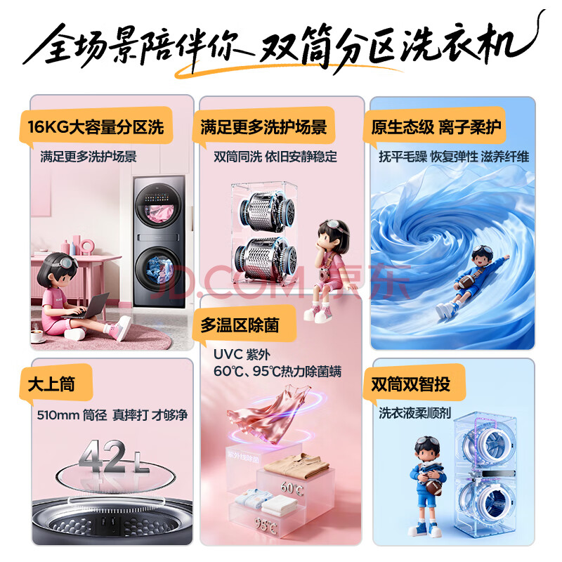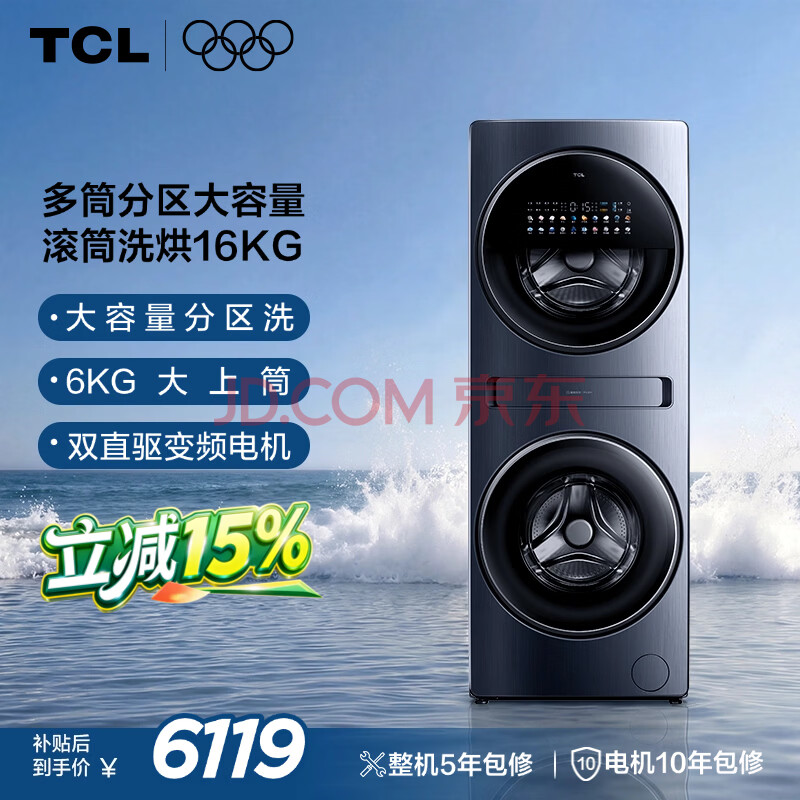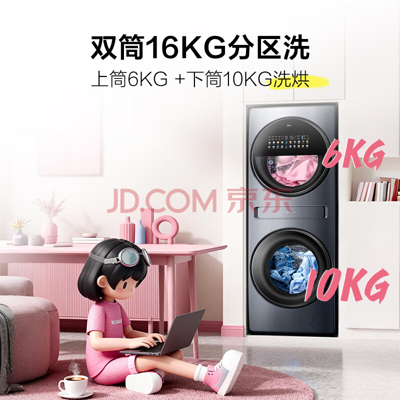 商品相册:TCL双子舱Q10滚筒洗衣机全自动洗烘一体16KG大容量子母多筒分区家电G160Q10-HDY第