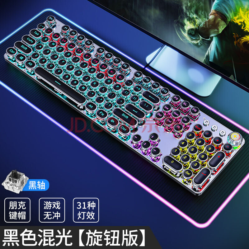 商品相册:前行者(EWEADN)TK100朋克机械键盘电竞游戏有线台式电脑笔记本外接办公打字复古外设吃鸡104键 黑色混光黑轴第