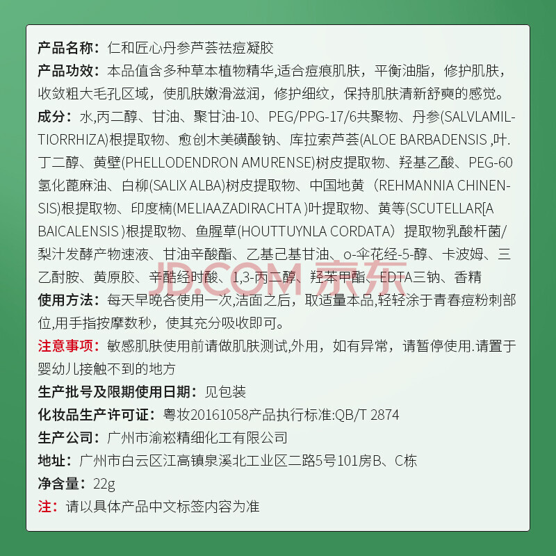 商品相册:仁和匠心祛痘凝胶22g丹参芦荟闭口粉刺痘印痘坑芦荟祛痘男女神节礼物第