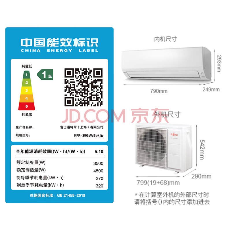 商品相册:富士通空调KJ系列 1.5匹1级能效15-21㎡适用 变频省电 铜管空调挂机ASQG12KJCB(KFR-35GW/Bpkjb)第