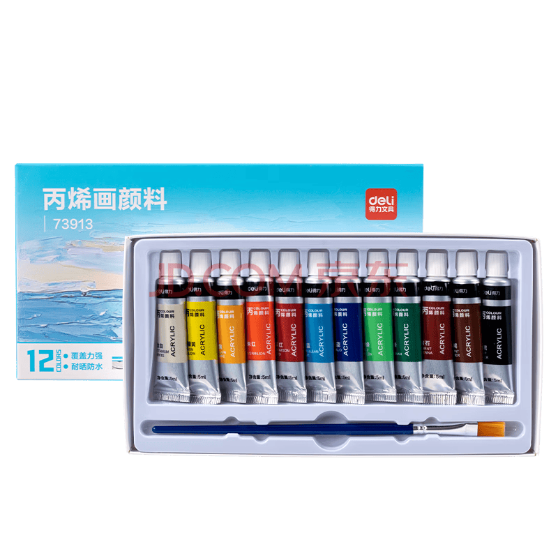 商品相册:得力(deli)丙烯颜料12色5ml初学带画笔美术入门套装绘画丙烯画改鞋写生黑板报墙绘手绘儿童美育工具第