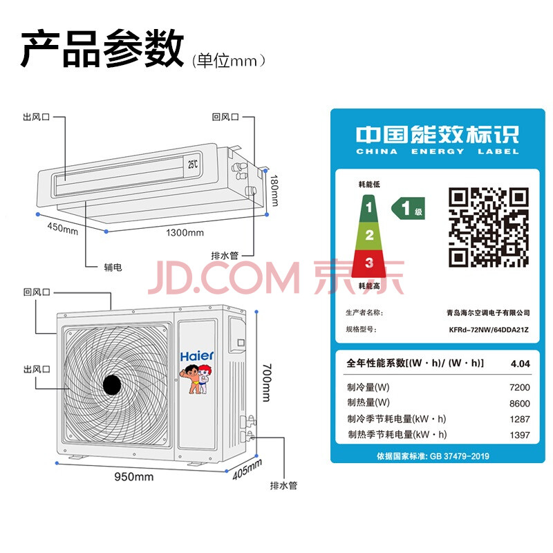 商品相册:海尔(Haier)中央空调 风管机一拖一 云璟3匹嵌入式空调 变频1级 KFRD-72NW/64DDA21Z裸机 京配第