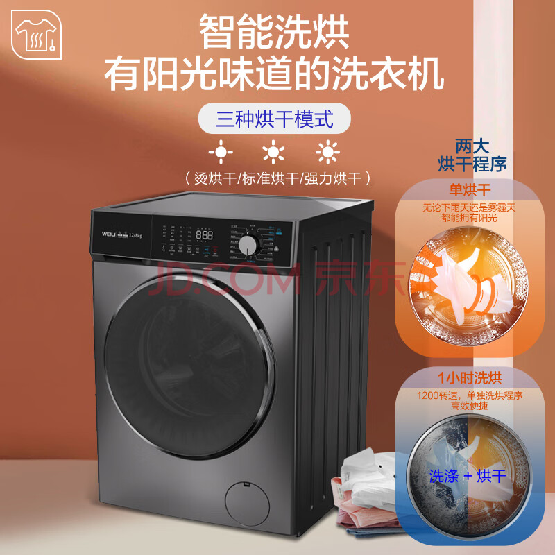 商品相册:威力(WEILI)滚筒洗衣机 12KG变频大容量洗烘一体 祛味空气洗蒸汽除菌 BLDC 送装一体XQG120-1428DPHX第