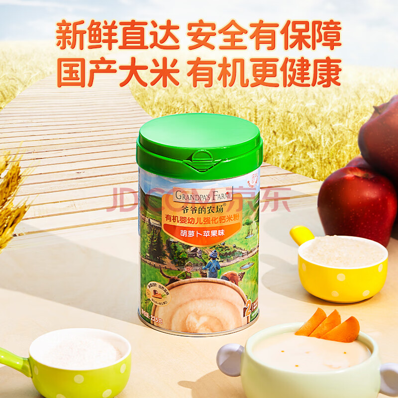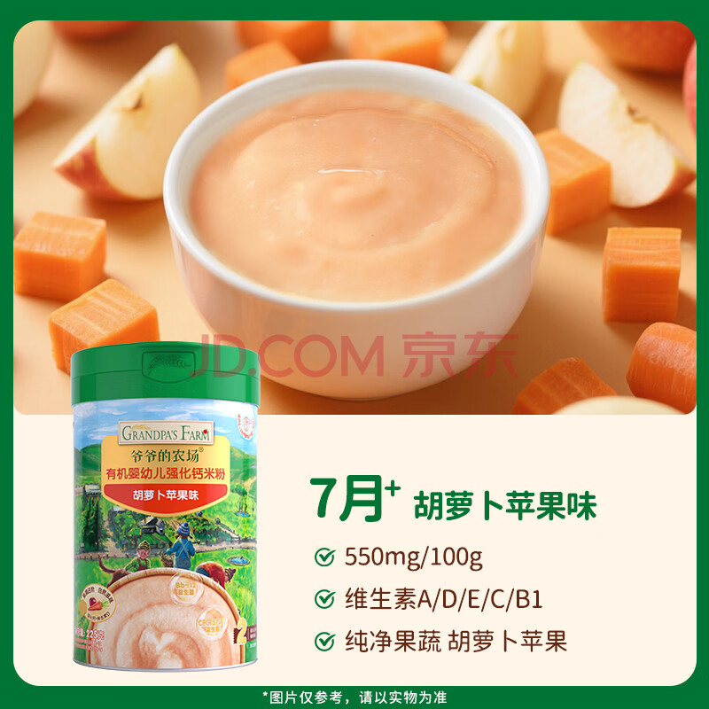 商品相册:爷爷的农场有机婴幼儿米粉6-12个月225g胡萝卜苹果味易冲泡米糊维D+钙7月+第1张/共8