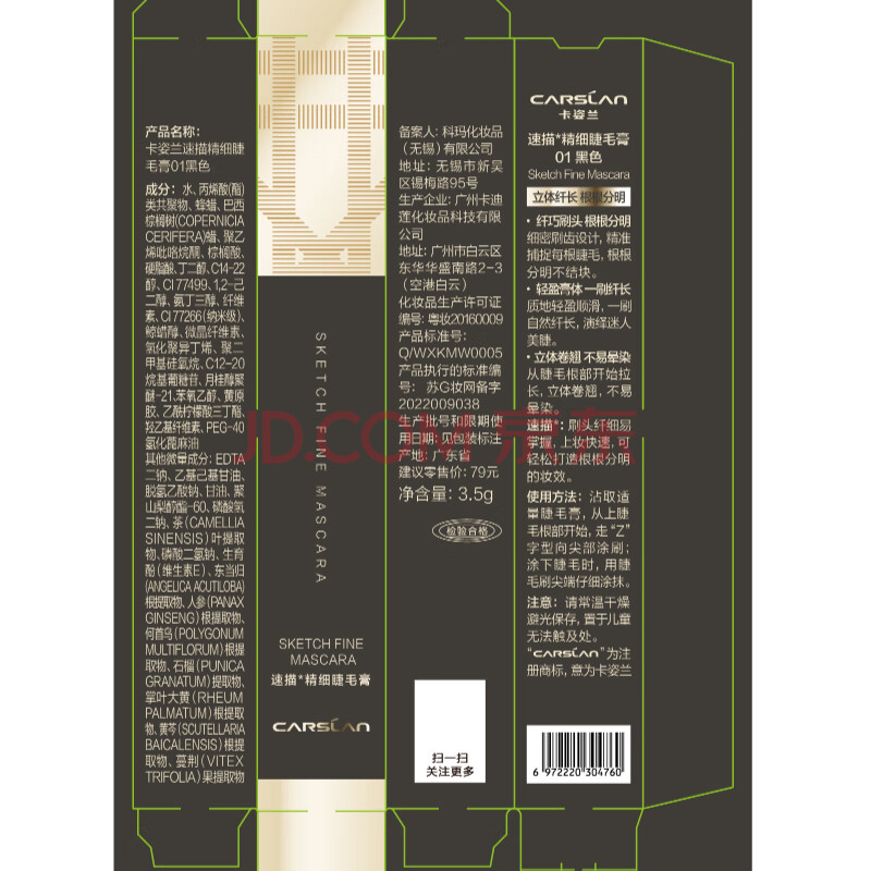 商品相册:卡姿兰(Carslan)速描精细睫毛膏(立体纤长持久定型不晕染)#01黑色3.5g 生日礼物女第