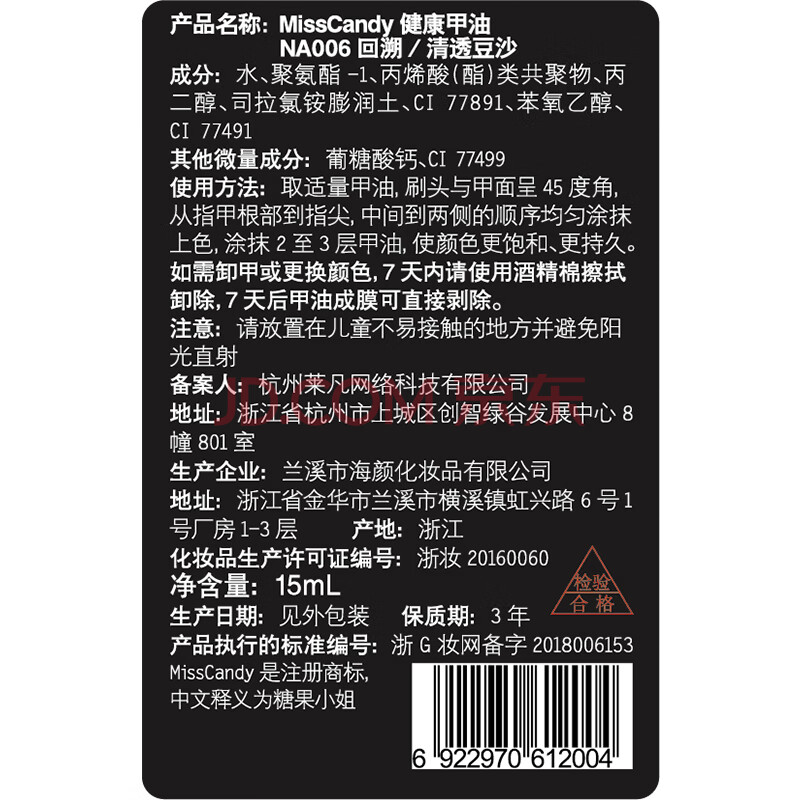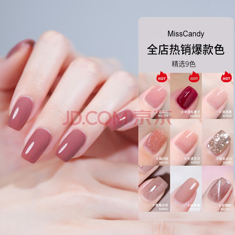 商品相册:Miss Candy显白素颜甲15ml指甲油免烤快干持久可撕拉裸色美甲 清透豆沙NA006第1张/共6