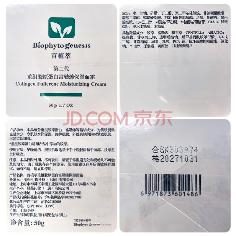 商品相册:百植萃重组胶原蛋白富勒烯保湿面霜50g女滋润补水屏障 生日送女朋友礼物第