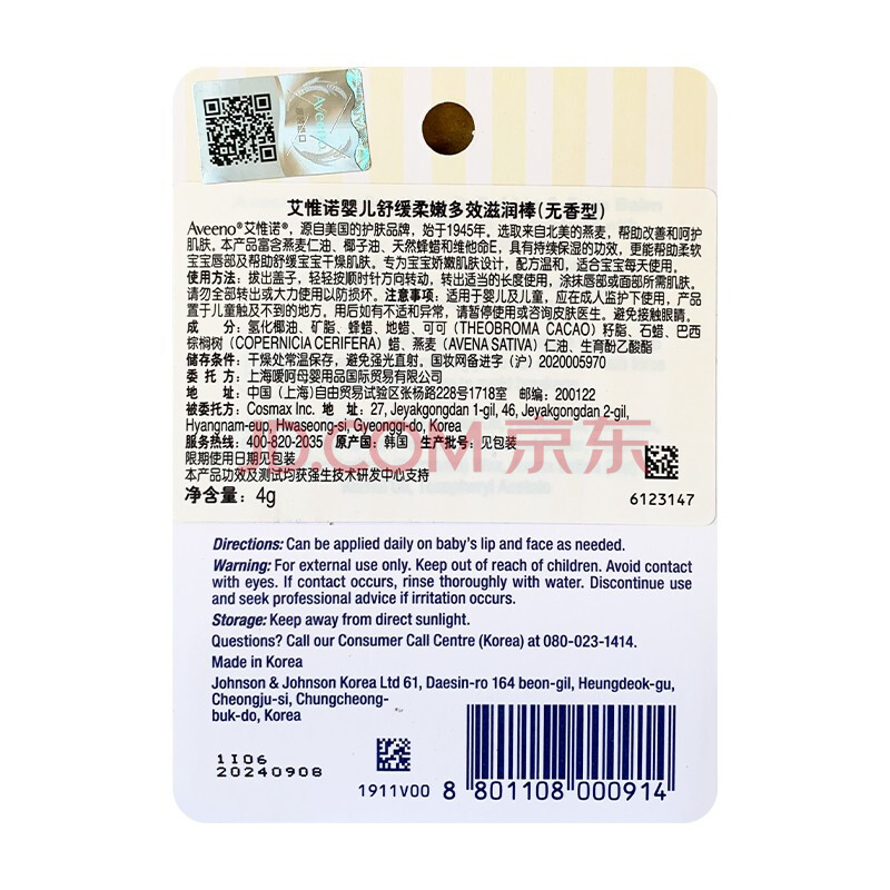 商品相册:艾惟诺(Aveeno)艾维诺婴儿润唇膏 儿童保湿滋润防干裂 温和无刺激成人唇膏4g第