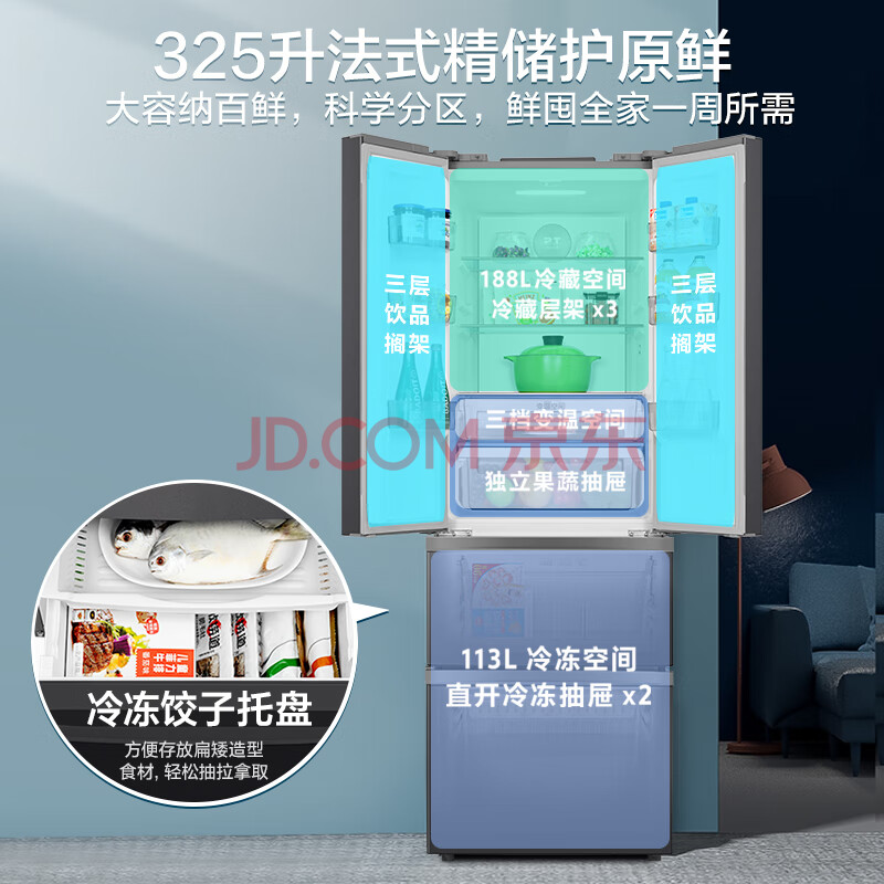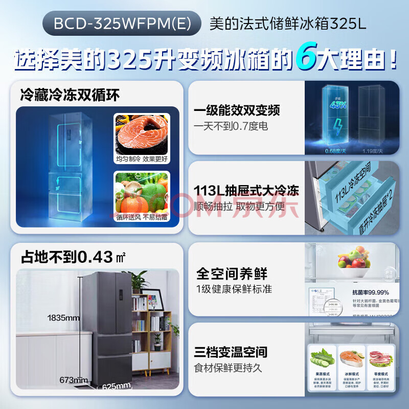 商品相册:美的(Midea)325L法式四开门冰箱小户型超薄风冷无霜一级能效变频节能净味BCD-325WFPM(E)第