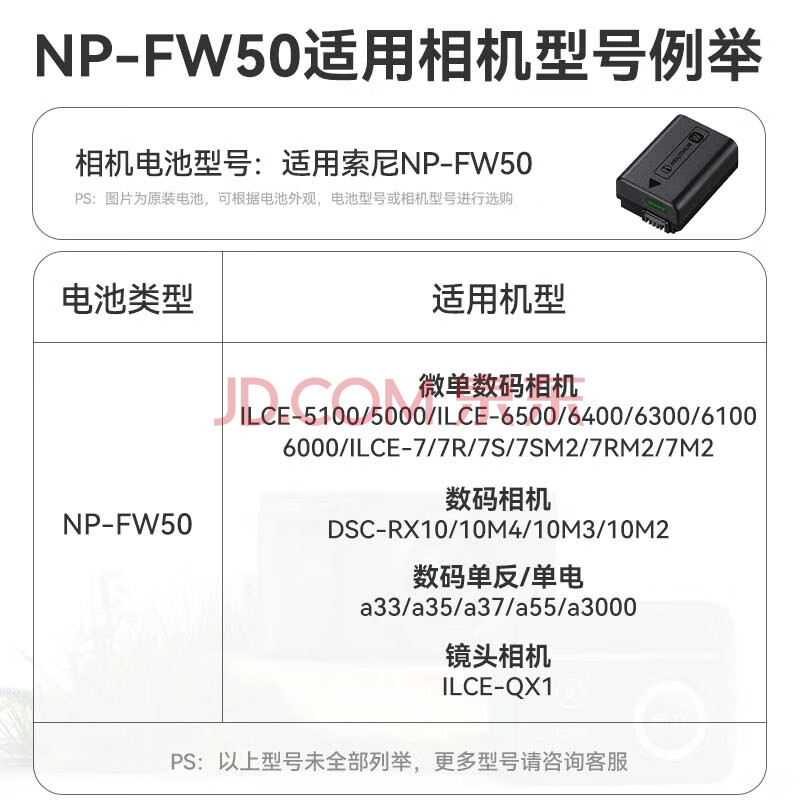 商品相册:绿巨能(llano)适用索尼NP-FW50相机电池ZV-E10 A6000 A6100 A6400 A6500 A6300 A7M2 A5100 A7S2微单电池第