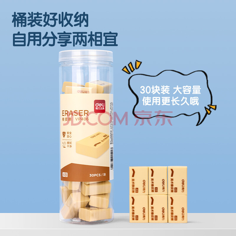 商品相册:得力(deli) 30块装黄色桶装橡皮擦 中考高考美术绘图橡皮柔软易擦少屑学生开学文具第