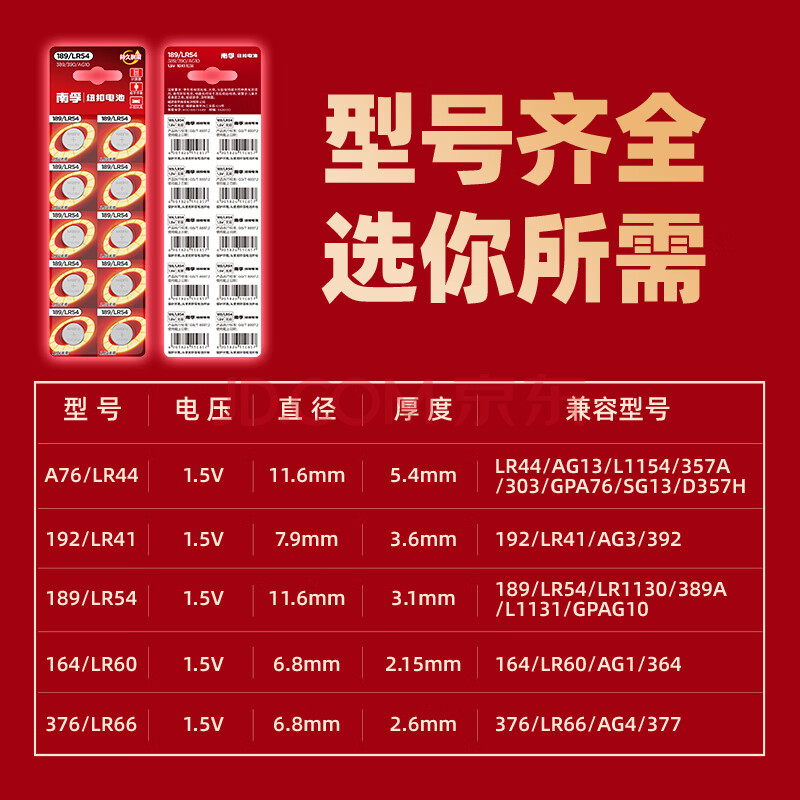 商品相册:南孚LR54/189/AG10/LR1130/389/390纽扣电池10粒装 适用于手表电池计算器电池电子玩具电池等第