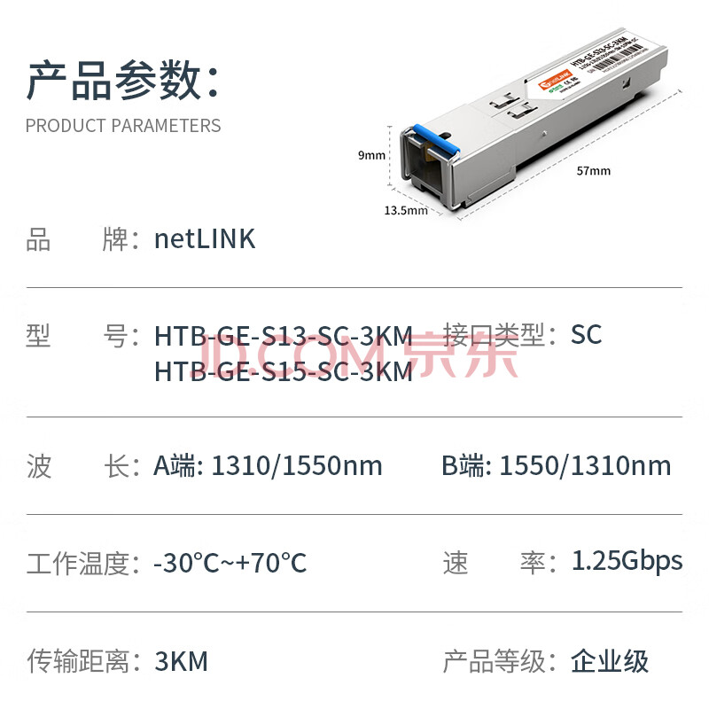 商品相册:netLINK sfp千兆光模块 1.25G单模单纤A端+B端 3km sc 适用国产设备 一对 HTB-GE-S13/S15-SC-3KM第