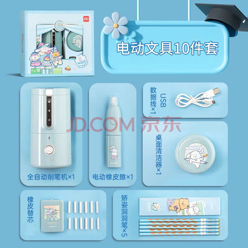 商品相册:得力(deli)全自动电动文具礼盒套装电动削笔机桌面吸尘器电动橡皮擦铅笔橡皮生日礼物开学考试文具10件套第