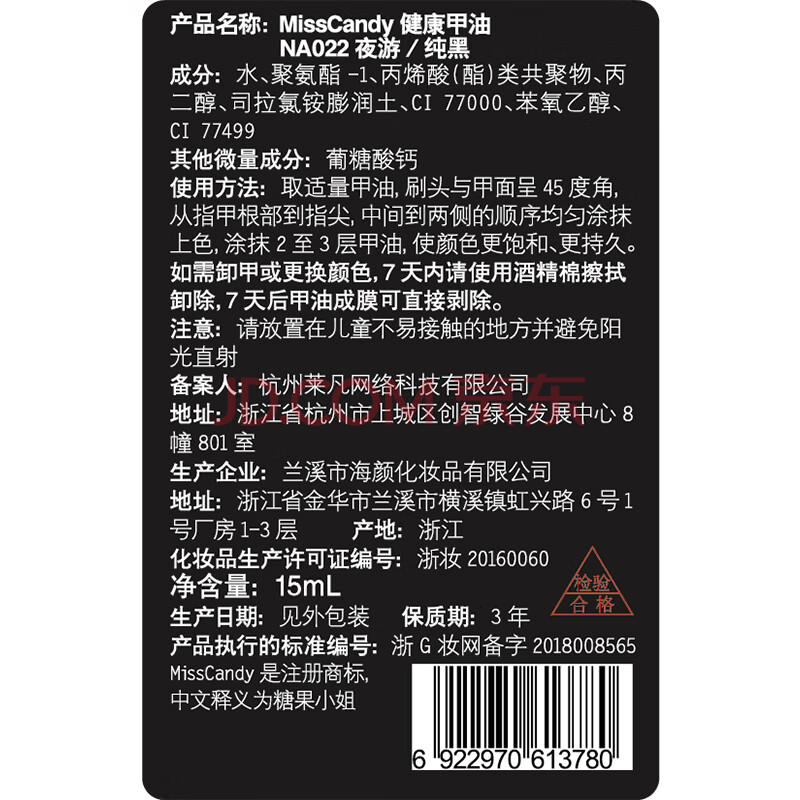 商品相册:Miss Candy显白健康15ml指甲油免烤快干持久可撕拉百搭黑色美甲 纯黑NA022第