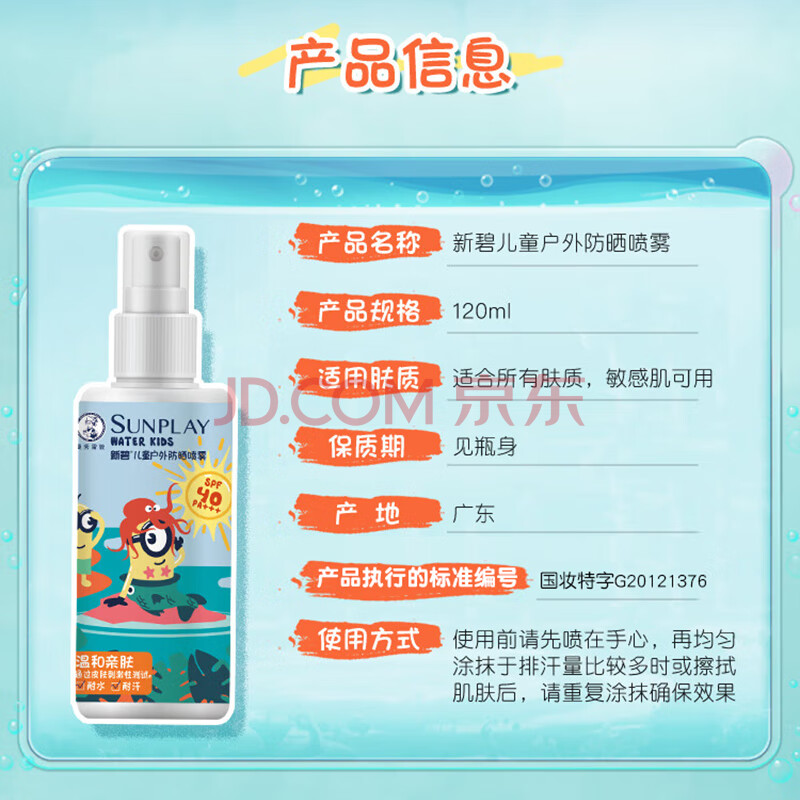 商品相册:曼秀雷敦新碧儿童防晒喷雾120ml SPF40 儿童防晒乳 耐水耐汗敏感肌防晒霜第