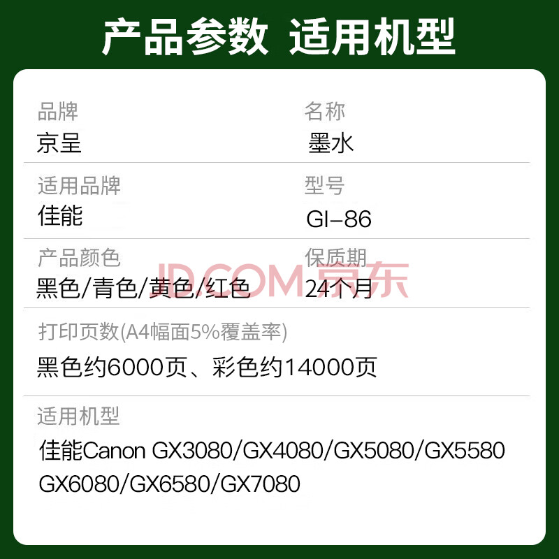 商品相册:京呈GI-86 BK 黑色墨水适用佳能Canon GX5080 GX5580 6080 6580 商用打印机墨水墨盒GX7080 3080 4080黑彩颜料 第