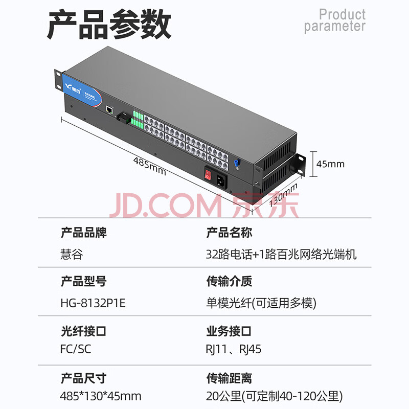 商品相册:慧谷 电话光端机32路电话+1路百兆网络 PCM语音光端机 电话光纤收发器延长器 SC接口 HG-8132P1E第